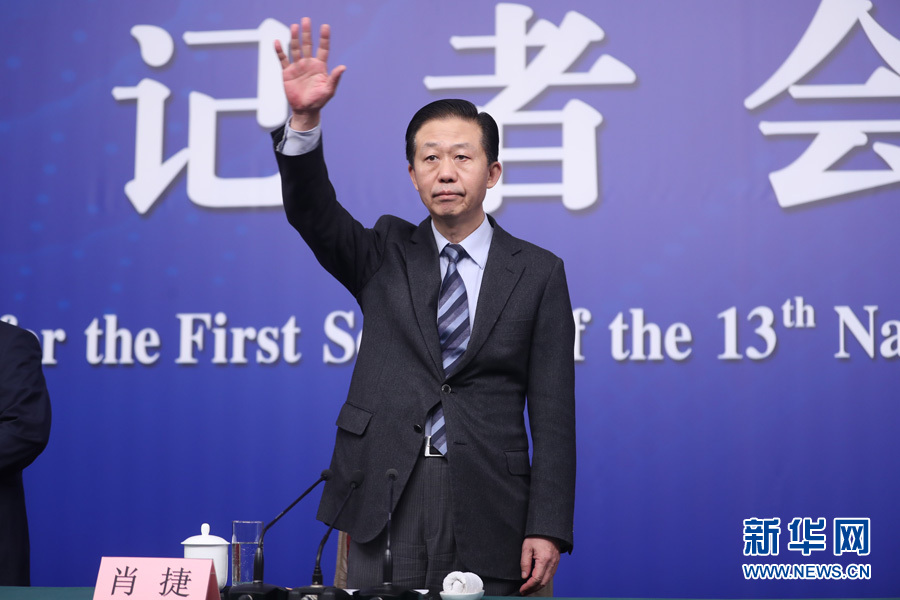 十三屆全國人大一次會議新聞中心于3月7日上午在梅地亞中心多功能廳舉行記者會,邀請財(cái)政部部長肖捷,副部長史耀斌、胡靜林就“財(cái)稅改革和財(cái)政工作”相關(guān)問題回答中外記者提問。圖為財(cái)政部部長肖捷向記者舉手示意。新華網(wǎng)/中國政府網(wǎng) 翟子赫 攝