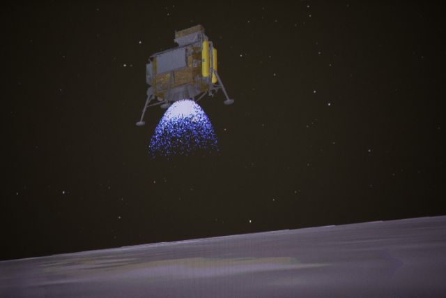 圖為1月3日在北京航天飛行控制中心拍攝的降落過程(示意圖)。1月3日10時26分,嫦娥四號探測器自主著陸在月球背面南極-艾特肯盆地內(nèi)的馮·卡門撞擊坑內(nèi),實(shí)現(xiàn)人類探測器首次在月球背面軟著陸。新華社記者 金立旺 攝