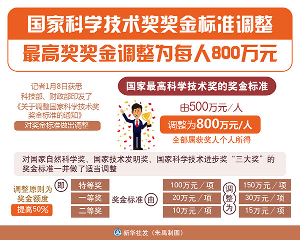 圖表:國家科學技術(shù)獎獎金標準調(diào)整 最高獎獎金調(diào)整為每人800萬元 新華社發(fā) 朱禹 制圖