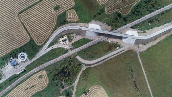 平改立工程K11公里道口,已建成的沙土橋梁。可以看到下橋的輔路和橋梁之間,完全沒有預留轉彎的空間。(8月28日 航拍圖)達日罕攝