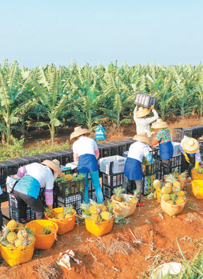 廣東湛江市徐聞縣盛產(chǎn)菠蘿,種植面積達35萬畝,年產(chǎn)量近50萬噸。春節(jié)臨近,菠蘿開始大量上市。圖為村民在田間將菠蘿打包裝車,準備銷往全國各地。羅艾樺 陳北跑攝影報道