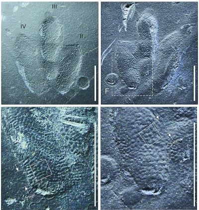 這些精致的小龍足跡一共有4個,組成了一道行跡,仿佛跨越了1億年的時空遇到人類?!靶↓堊阚E僅在韓國和中國發現,是東亞白堊紀的特有足跡。這是世界上第10處發現有小龍足跡的化石點,也是首次發現這種足跡的皮膚印痕。”林鐘悳告訴記者。此前,古生物學家從未發現過有如此完美的皮膚印痕,足跡上的鱗片痕跡平均直徑還不到0.4毫米,而且不同于此前的鱗片印痕僅出現在足跡的部分區域,小龍足跡保存了整個腳底的皮膚。