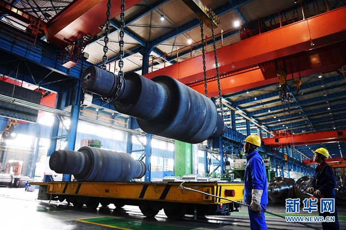 在中國(guó)一重集團(tuán)有限公司的生產(chǎn)車(chē)間,起重機(jī)吊起產(chǎn)品(2018年9月27日攝)。新華社記者 王建威 攝