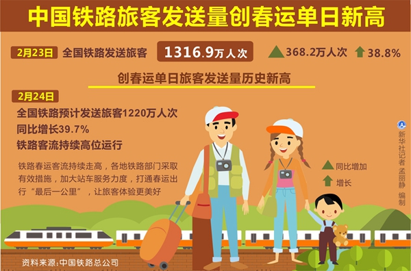 新華社北京2月24日電(記者樊曦)記者從中國鐵路總公司獲悉,2月23日,全國鐵路發送旅客1316.9萬人次,同比增加368.2萬人次,增長38.8%,創春運單日旅客發送量歷史新高。