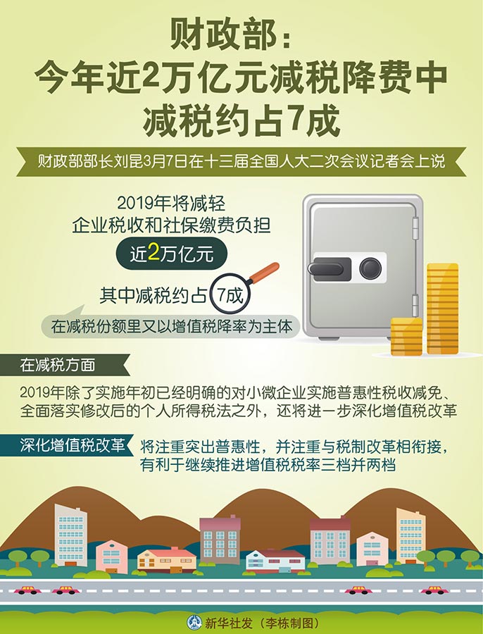 新華社北京3月7日電(記者申鋮、劉紅霞)財政部部長劉昆7日在十三屆全國人大二次會議記者會上說,今年將減輕企業稅收和社保繳費負擔近2萬億元,其中減稅約占7成,在減稅份額里又以增值稅降率為主體。