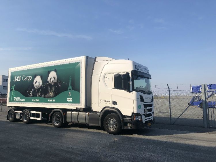 4月4日,在丹麥首都哥本哈根的凱斯楚普國際機場,一輛印有歡迎“星二”和“毛筍”(“毛二”的乳名)來哥本哈根字樣的集裝箱卡車等待運送大熊貓。(新華社發 何李杰攝)