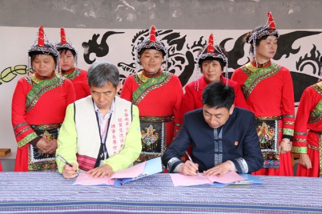 太源畬族鄉鄉長雷諄身(右)與中華兩岸少數民族文化經貿交流協會理事長廖世杰簽署兩岸少數民族交流合作備忘錄現場。(李娜 攝)