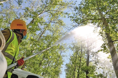 4月14日上午,東五環外機場高速治理現場,園林工人使用高壓水槍噴灑方式治理楊柳絮。北京市園林綠化局供圖