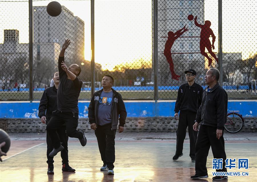 市民在新疆石河子大學的一處籃球場晨練(4月10日攝)。新華社記者 王菲 攝