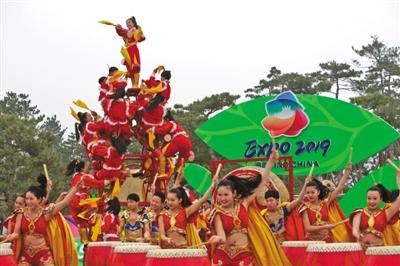 世園會開園首日的花車巡游于上午10時開始,表演時間為40分鐘。10時10分,花車從國際館附近緩緩經過,吸引不少游客駐足觀看。
