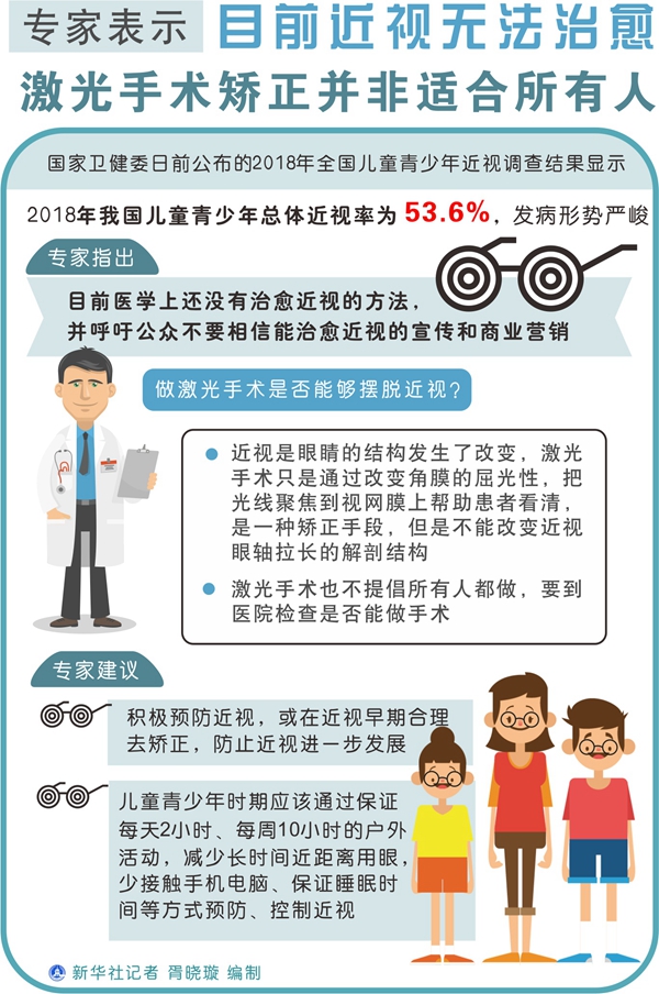 新華社北京5月3日電(記者王秉陽、溫競華)國家衛健委日前公布的2018年全國兒童青少年近視調查結果顯示,2018年我國兒童青少年總體近視率為53.6%,發病形勢嚴峻。有的家長寄希望于近視后的治療,而且有不少商家宣稱可治愈近視。專家指出,目前醫學上還沒有治愈近視的方法,并呼吁公眾不要相信能治愈近視的宣傳和商業營銷。
