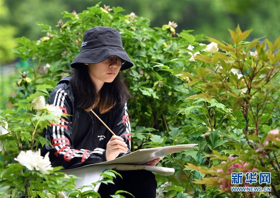 寫(xiě)生愛(ài)好者在洛陽(yáng)國(guó)家牡丹園內(nèi)寫(xiě)生(4月24日攝)。新華社記者 李嘉南 攝