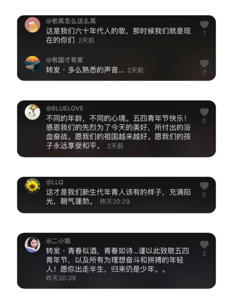 一首首歌喚起了不同年代人們的青春記憶,也展現了新時代青年的青春活力。清華大學、上海交通大學、蘭州大學、復旦大學、中央民族大學、北京電影學院、安徽大學等數十所知名高校參加,中國科學技術大學附屬中學、北京101中學等一批小童鞋也不甘示弱,國家電網、上海鐵路局甚等單位駐海外青年人也紛紛發來視頻。