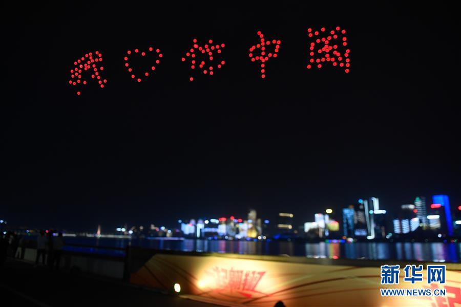 5月20日,約150架無人機空中編隊在錢塘江上空組成“我愛你中國”字樣。 當晚,在浙江杭州錢塘江畔,城市燈光秀和約150架無人機組成的空中編隊表演交相輝映。“520中國”“我愛你中國”“70年”……對祖國進行的一場“深情告白”閃耀錢塘兩岸。 新華社記者黃宗治攝