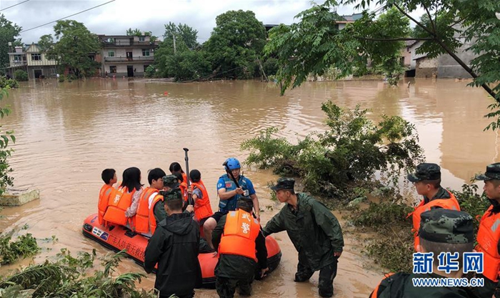 6月7日,武警江西省總隊(duì)上饒支隊(duì)官兵在玉山縣六都鄉(xiāng)六都村轉(zhuǎn)移被洪水圍困的群眾。新華社發(fā)(吳展 攝)