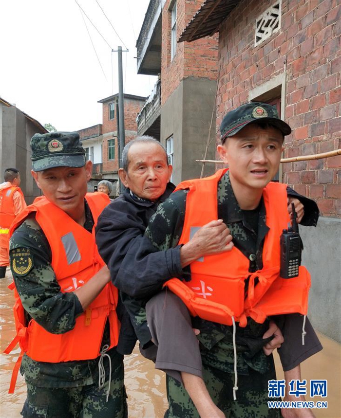 6月7日,武警江西省總隊(duì)上饒支隊(duì)官兵在玉山縣下鎮(zhèn)鎮(zhèn)白橋村轉(zhuǎn)移被洪水圍困的老人。新華社發(fā)(吳展 攝)