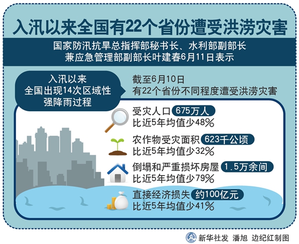 新華社北京6月11日電(記者胡璐)國家防汛抗旱總指揮部秘書長、水利部副部長兼應急管理部副部長葉建春11日表示,入汛以來全國出現14次區域性強降雨過程。截至6月10日,有22個省份不同程度遭受洪澇災害,受災人口675萬人,比近5年均值少48%。