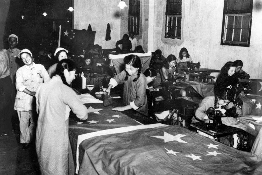 趕制國(guó)旗時(shí)臉上真摯的笑容。