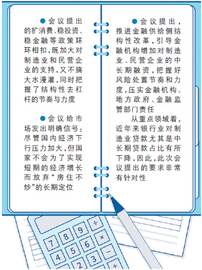 中共中央政治局會議提出,推進金融供給側結構性改革,引導金融機構增加對制造業、民營企業的中長期融資,把握好風險處置節奏和力度,壓實金融機構、地方政府、金融監管部門責任。