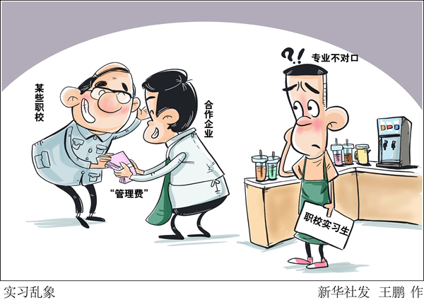 學(xué)機電工程的卻被安排去賣飲料,送一名學(xué)生去企業(yè)“實習(xí)”能拿上千元“管理費”……實習(xí)本是職業(yè)學(xué)校技能人才培養(yǎng)的重要一環(huán),但記者調(diào)查發(fā)現(xiàn),有的職校隨意安排與專業(yè)不相關(guān)、不相近的實習(xí)崗位,有的職校把學(xué)生當(dāng)成廉價勞動力“出賣”給企業(yè)。
