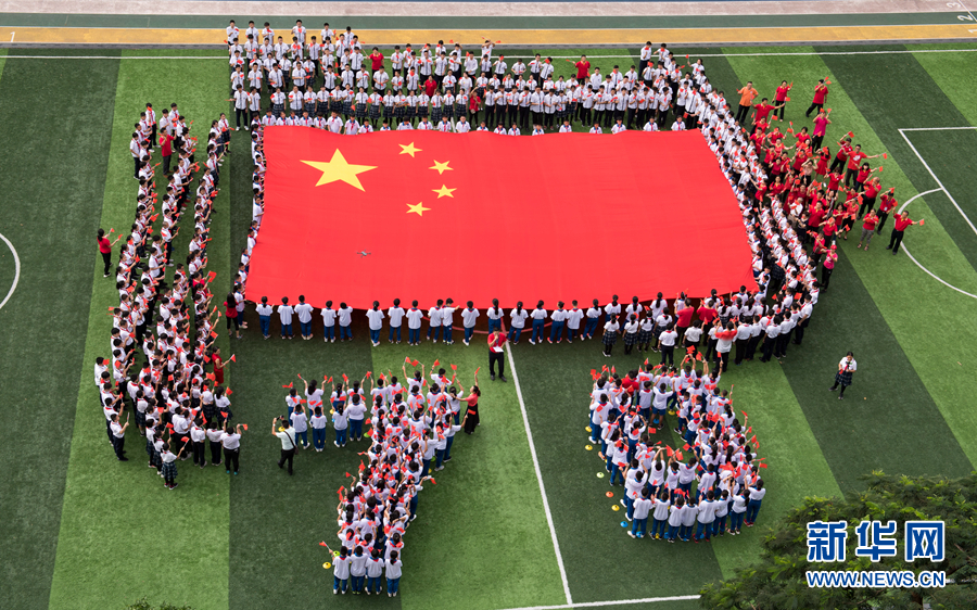 一面巨幅國旗在廣州市陳嘉庚紀念中學綠茵操場上格外引人注目(9月1日攝)。新華社發