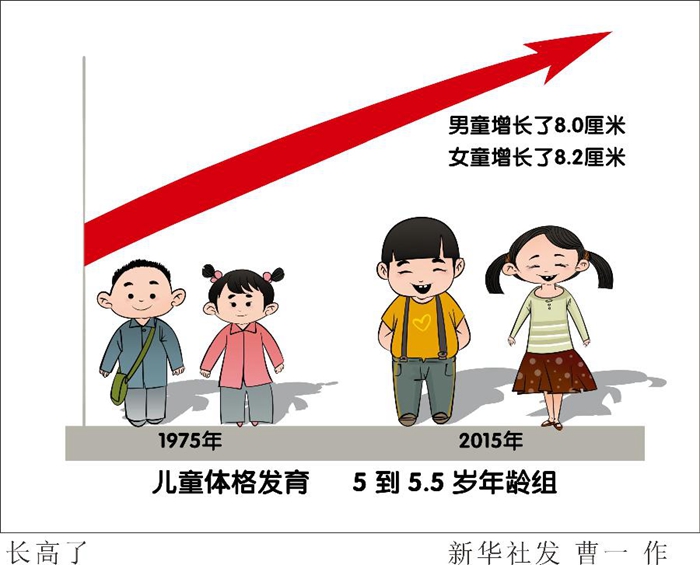 國家衛(wèi)健委一項針對9市7歲以下兒童體格發(fā)育的調(diào)查也印證了這條“曲線”:從1975年到2015年,我國兒童身高、體重指標均持續(xù)快速增長。以最具代表性的5到5.5歲年齡組為例,男童和女童身高分別增長了8.0厘米和8.2厘米。