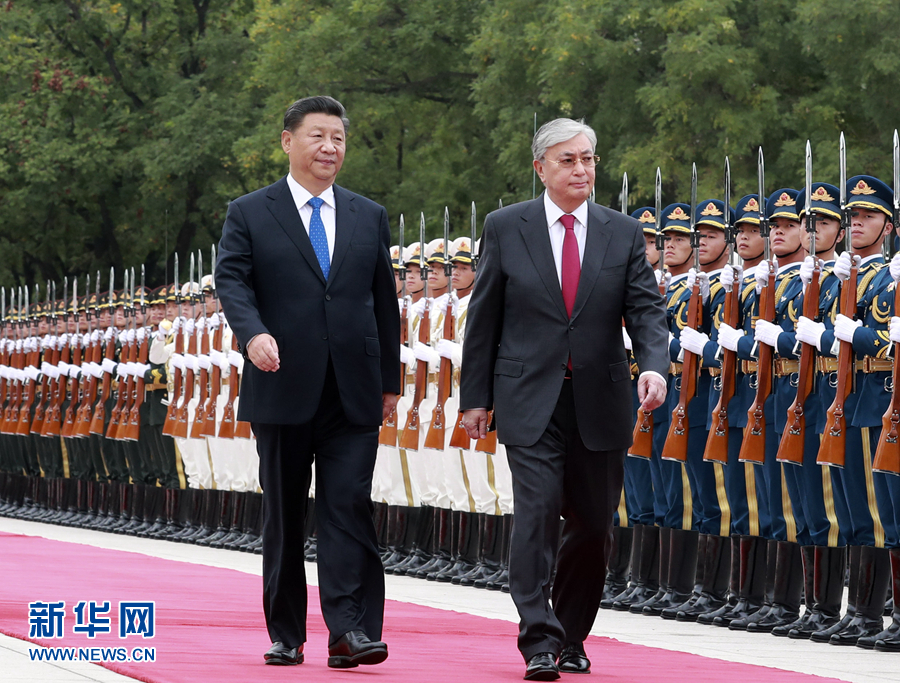 9月11日,國家主席習近平在北京人民大會堂同哈薩克斯坦總統托卡耶夫舉行會談。這是會談前,習近平在人民大會堂東門外廣場為托卡耶夫舉行歡迎儀式。 新華社記者 丁林 攝