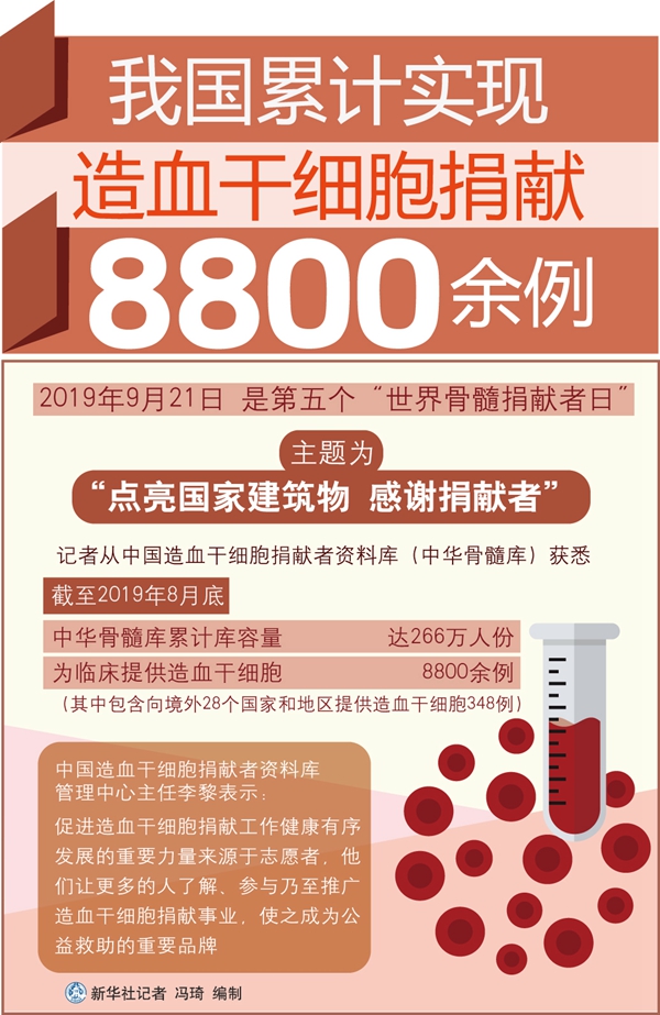 新華社西安9月21日電(記者藺娟 吳鴻波)記者從中國造血干細胞捐獻者資料庫(中華骨髓庫)獲悉,截至2019年8月底,中華骨髓庫累計庫容量已達266萬人份,為臨床提供造血干細胞8800余例,其中包含向境外28個國家和地區提供造血干細胞348例。