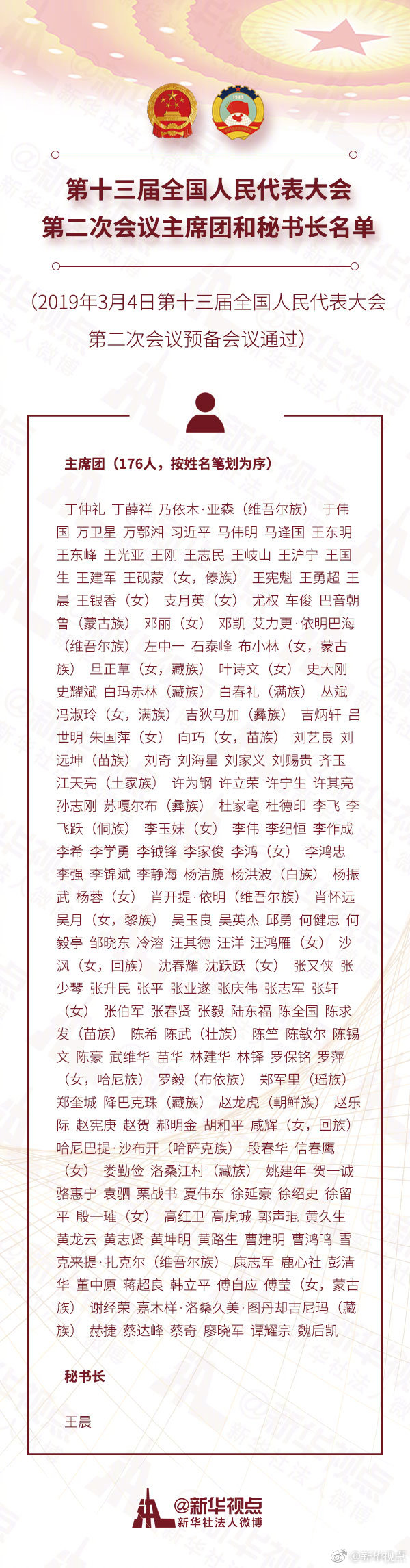 (兩會受權發布)第十三屆全國人民代表大會第二次會議主席團和秘書長名單