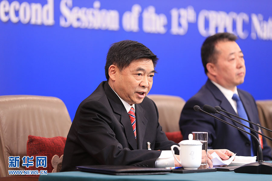 全國政協十三屆二次會議3月5日15:00在梅地亞中心多功能廳舉行記者會,邀請5位全國政協委員就“打贏防范化解重大風險、精準脫貧、污染防治三大攻堅戰”回答記者提問。圖為主持人舒啟明。新華網/中國政府網 劉廈 攝