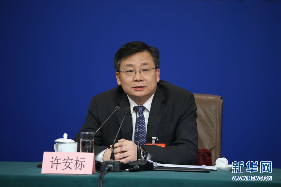 十三屆全國人大二次會議新聞中心3月9日在梅地亞中心新聞發布廳舉行記者會,邀請全國人大農業與農村委員會主任委員陳錫文、全國人大財政經濟委員會副主任委員烏日圖、全國人大常委會法制工作委員會副主任劉俊臣、全國人大常委會法制工作委員會副主任許安標、全國人大環境與資源保護委員會委員程立峰就“人大立法工作”相關問題回答記者提問。圖為全國人大常委會法制工作委員會副主任許安標。新華網/中國政府網 劉廈 攝
