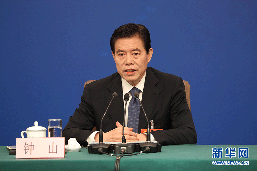 十三屆全國人大二次會議新聞中心3月9日(星期六)10時30分在梅地亞中心新聞發(fā)布廳舉行記者會,邀請商務部部長鐘山、副部長兼國際貿(mào)易談判副代表王受文、副部長錢克明就“促進形成強大國內(nèi)市場 推動全方位對外開放”相關問題回答中外記者提問。圖為商務部部長鐘山。新華網(wǎng)/中國政府網(wǎng) 陳杰 攝