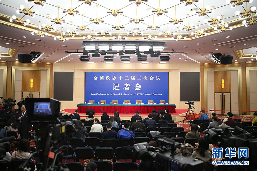 全國政協(xié)十三屆二次會(huì)議3月10日(星期日)上午8:45在梅地亞兩會(huì)新聞中心舉行記者會(huì),邀請(qǐng)5位政協(xié)委員就“新時(shí)代政協(xié)履職”回答記者提問。圖為記者會(huì)現(xiàn)場。新華網(wǎng)、中國政府網(wǎng)進(jìn)行現(xiàn)場直播。新華網(wǎng)/中國政府網(wǎng) 劉廈攝