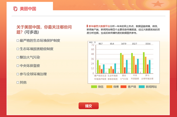 綠水青山是你我都關(guān)注的熱點(diǎn)。在新華網(wǎng)推出的2019全國兩會熱點(diǎn)調(diào)查中,新華睿思大數(shù)據(jù)通過監(jiān)測新聞網(wǎng)站、論壇、微信、微博、APP、平媒6個信源,分析結(jié)果顯示,全國兩會開幕以來,關(guān)于生態(tài)環(huán)境的話題共832 4987個。