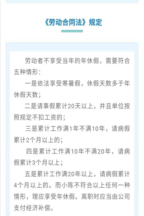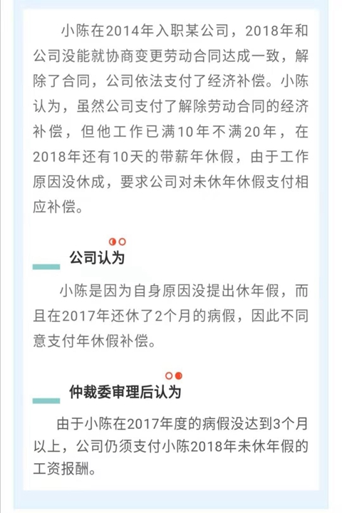 未休年假能要求經(jīng)濟(jì)補(bǔ)償嗎?人社部官方微信2日發(fā)布案例,小陳2018年和公司解除了合同,公司依法支付了經(jīng)濟(jì)補(bǔ)償。小陳認(rèn)為,他工作已滿10年不滿20年,在2018年還有10天的帶薪年休假,由于工作原因沒休成,要求公司對未休年休假支付相應(yīng)補(bǔ)償。此訴求最終獲得仲裁委支持。(李金磊)