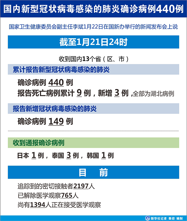 截至1月21日24時,國家衛(wèi)健委收到國內(nèi)13個省(區(qū)、市)累計(jì)報告新型冠狀病毒感染的肺炎確診病例440例,報告死亡病例累計(jì)9例,新增3例,全部為湖北病例。