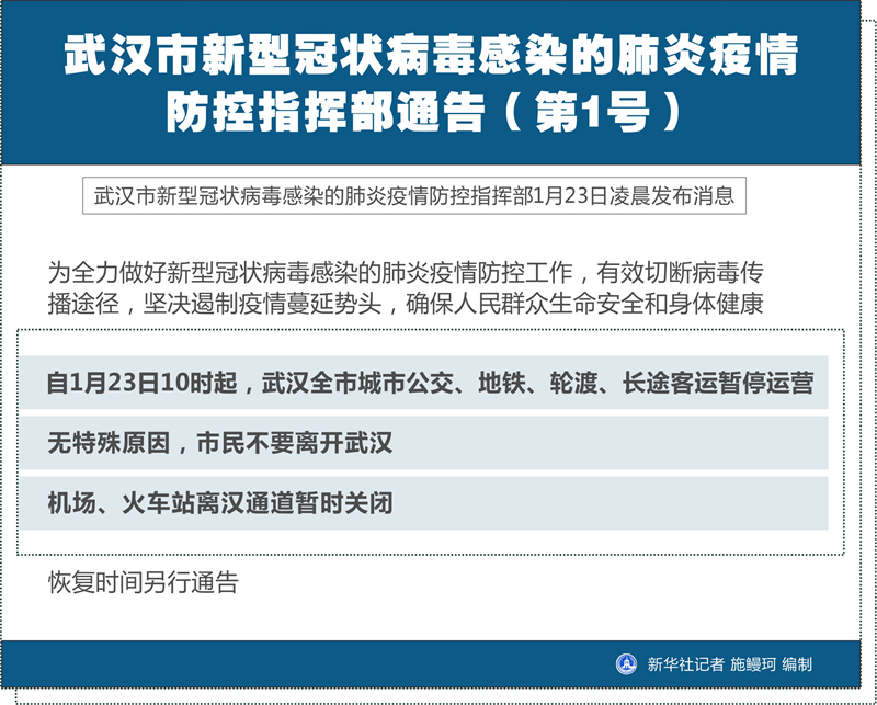 新華社武漢1月23日電(記者馮國棟)武漢市新型冠狀病毒感染的肺炎疫情防控指揮部1月23日凌晨發(fā)布消息,為全力做好新型冠狀病毒感染的肺炎疫情防控工作,有效切斷病毒傳播途徑,堅決遏制疫情蔓延勢頭,確保人民群眾生命安全和身體健康,自1月23日10時起,武漢全市城市公交、地鐵、輪渡、長途客運暫停運營;無特殊原因,市民不要離開武漢;機場、火車站離漢通道暫時關(guān)閉。恢復(fù)時間另行通告。