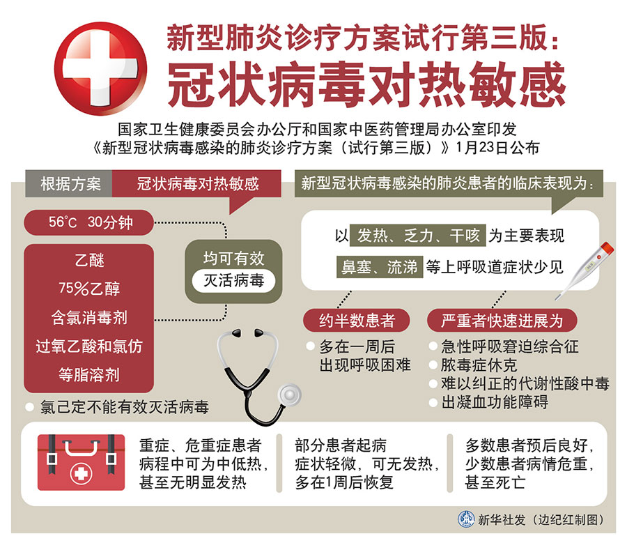 新華社北京1月23日電(記者田曉航、王秉陽)為進一步指導全國科學規范做好新型冠狀病毒感染的肺炎病例診斷和醫療救治工作,在組織專家對診療方案進行修訂基礎上,國家衛生健康委員會辦公廳和國家中醫藥管理局辦公室印發《新型冠狀病毒感染的肺炎診療方案(試行第三版)》,23日公布。方案涉及冠狀病毒病原學特點、此次疫情的臨床特點、病例定義、鑒別診斷、病例的發現與報告等方面內容,給出了包括中醫治療在內的治療方案。