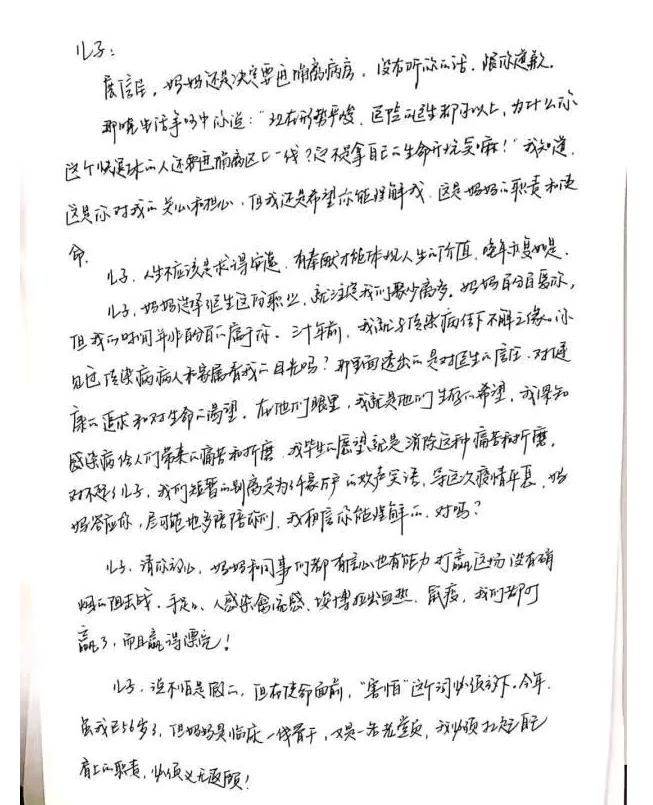 醫(yī)生曹曉英表示,這封信是在進(jìn)入隔離區(qū)前寫下留給兒子的。整個(gè)醫(yī)療團(tuán)隊(duì)有24名醫(yī)生,30多名護(hù)士,也和她一樣,大家住在醫(yī)院,與家人分離。