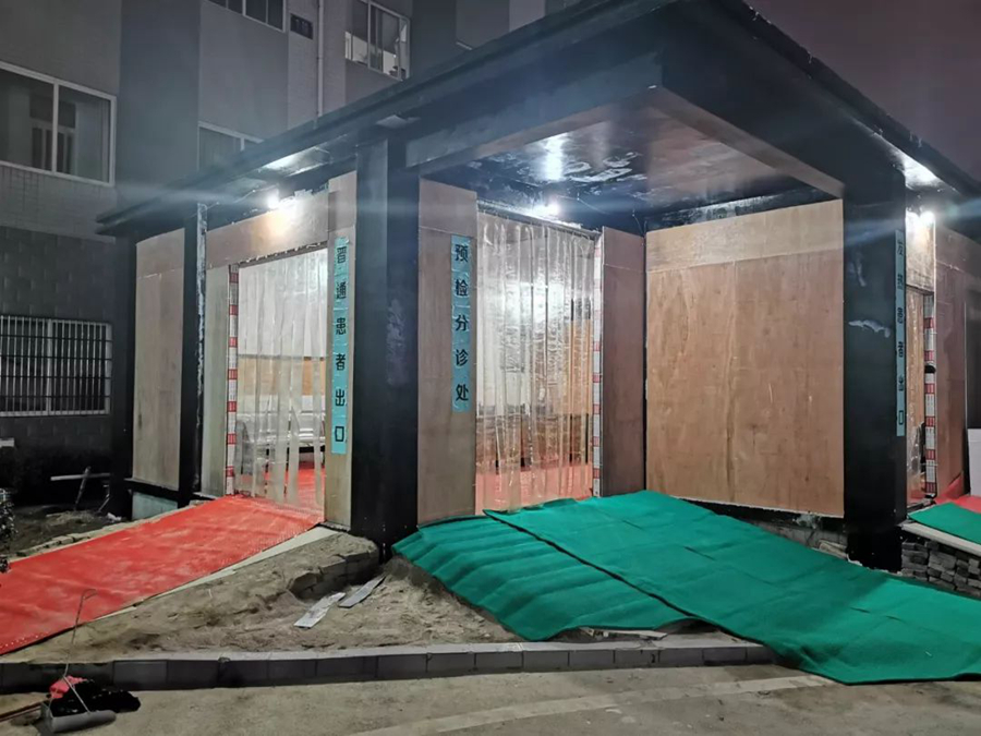 由于春節期間找不到建筑工人,在黨員帶領下,醫護人員和職工紛紛上陣,在一天不到的時間內,在三〇二醫院搭建起了初見雛形的預檢分診處。