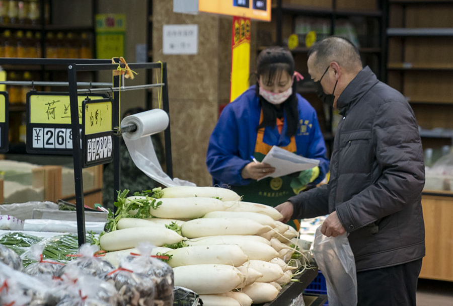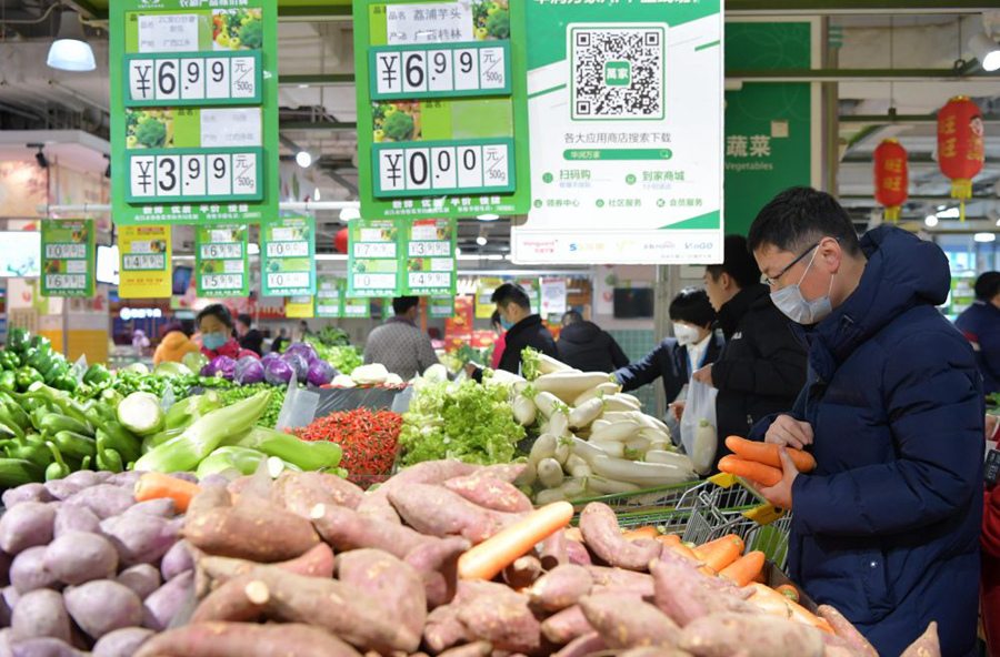 1月29日,市民在青島市一家大型超市內采購蔬菜。新華社記者李紫恒攝
