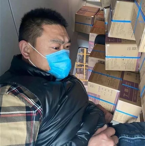 1月28日中午,山東退役軍人王曉驅車千里,到達武漢府河收費站高速路口,將車上的10萬雙醫用手套交給武漢的志愿者。