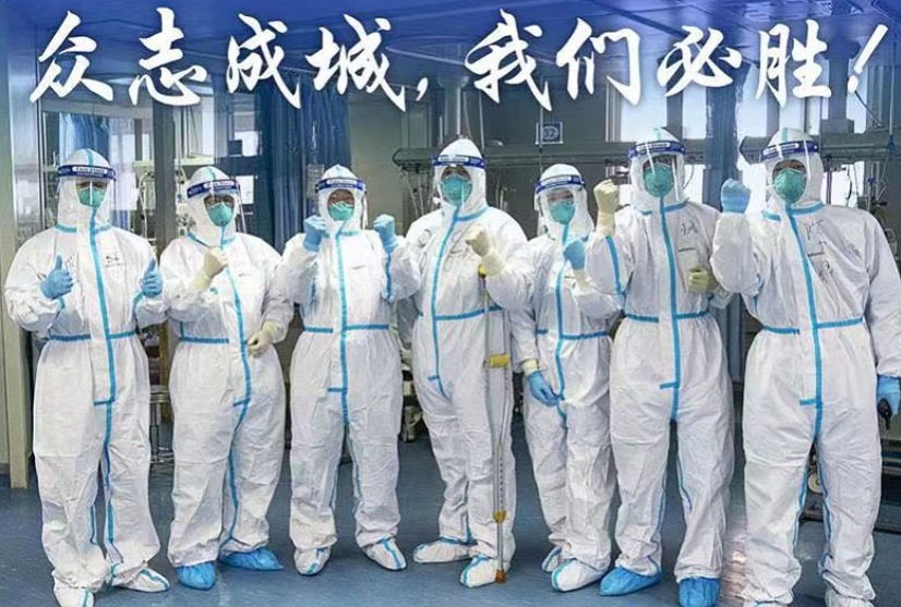1月24日,武漢大學中南醫院重癥隔離病房內的醫護人員一起鼓勁加油。