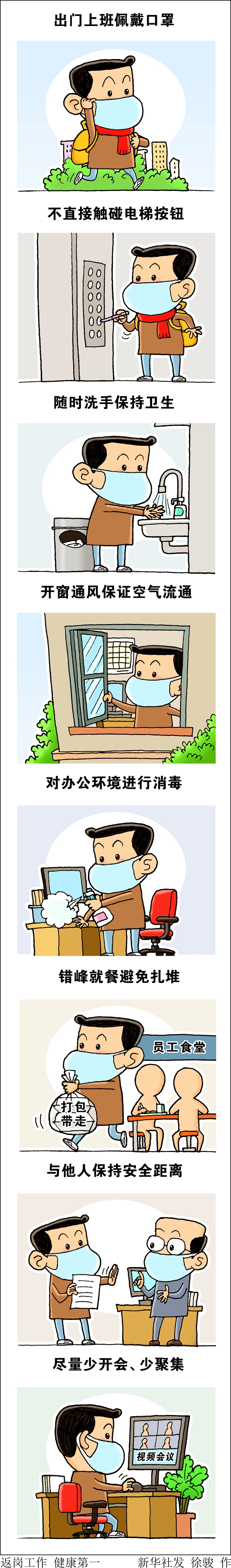 春節長假結束,人們陸續返崗復工,開始新一年的忙碌。當前,疫情形勢依然嚴峻,節后上班切莫讓麻痹“上崗”,更需做好衛生防護。佩戴口罩自不待言,避免扎堆就餐、勤洗手、勤消毒、避開密集人群、保持安全距離等,都是遠離病毒的必要舉措。寧可把風險想得高一點,也要把防控做得嚴一些。人人都是一道防線,做好本職工作是一種擔當,保護好自己也是一種擔當。道路千萬條,健康平安第一條。