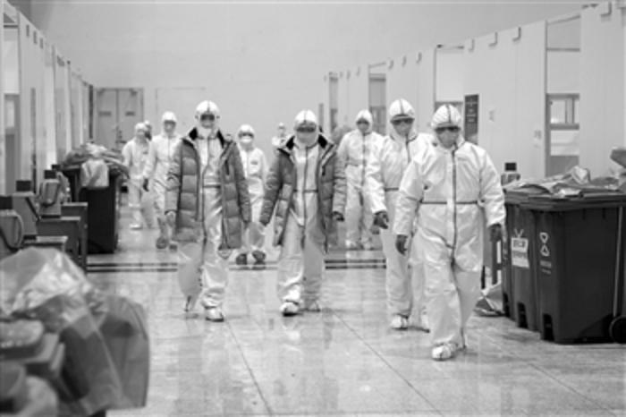 2月5日,身穿防護服的醫生走入武漢漢江方艙醫院,該市首個方艙醫院開始收治病人。 新華社記者 熊琦 攝