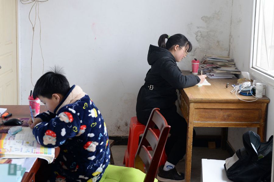 崔愛國和周超群的兩個孩子在衛生室已消毒的隔間內學習。(新華社記者黃博涵 攝)