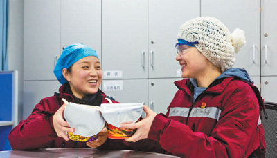 2月9日,中南大學湘雅二醫院援鄂醫療隊護士周杰楠(右)在武漢度過了29歲生日。在緊張的工作間隙,她與同樣是當天過生日的同事曾艷一起吃方便面當做慶祝。本報記者 張武軍攝