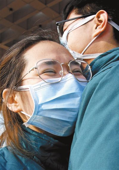 河南省直第三人民醫院的劉光耀(右)和喬冰是一對“90后”情侶,一起報名參加援鄂醫療隊。2月2日,醫療隊出發前,兩人擁抱著相互鼓勁。新華社記者 李 安攝