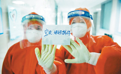 在湖北省十堰市鄖陽區人民醫院感染科,28歲的護士焦嬌堅守在隔離病區,偶爾才能與3歲的女兒視頻通話。圖為焦嬌(左)與同事將寫有“寶貝,媽媽想你”的紙條貼在玻璃上。周家山攝(人民視覺)