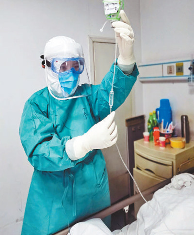 中山大學孫逸仙紀念醫院呼吸內科二區“90后”護師袁漢珍,與同事一起馳援武漢市漢口醫院,堅守病患救治一線。圖為袁漢珍正在為病人輸液。鮮 敢 張 陽攝影報道